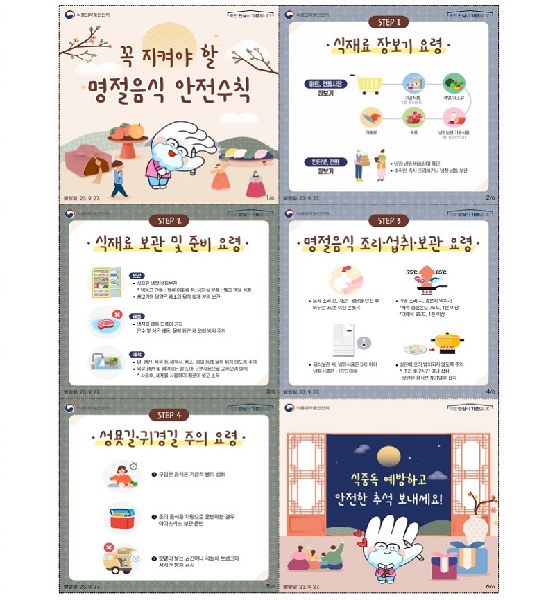 주요 내용은 ▲명절 음식 준비를 위한 식품 구매요령 ▲올바른 손 씻기 및 조리·보관 방법 등 식중독 예방수칙 ▲설사 등 식중독 증상 발생 시 행동 요령 ▲에어프라이어의 안전한 사용 방법 ▲명절 다빈도 사용 의료제품 안전사용 정보다.