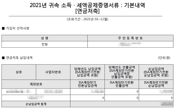 안정적인 노후를 위해 연금저축에 돈을 납입하는 사람들이 많을 텐데, 총급여액 5500만 원 이하자는 15%, 초과자는 12%의 세액공제를 받을 수 있다. 연금저축을 통해 노후도 대비하고 절세 혜택도 누릴 수 있었으면 한다. 나도 연금저축에 매달 꾸준히 일정액을 넣고 있으며, 큰 액수는 아니지만 소중한 세액공제 혜택을 누리고 있다.