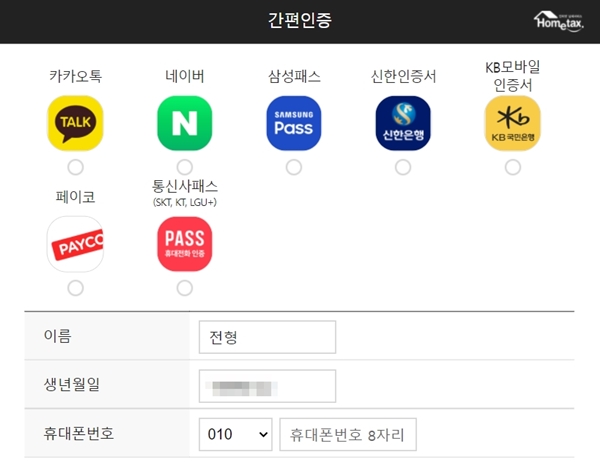 홈택스 로그인 시, 다양한 간편인증으로 접속 가능하다.(출처=홈택스 누리집)