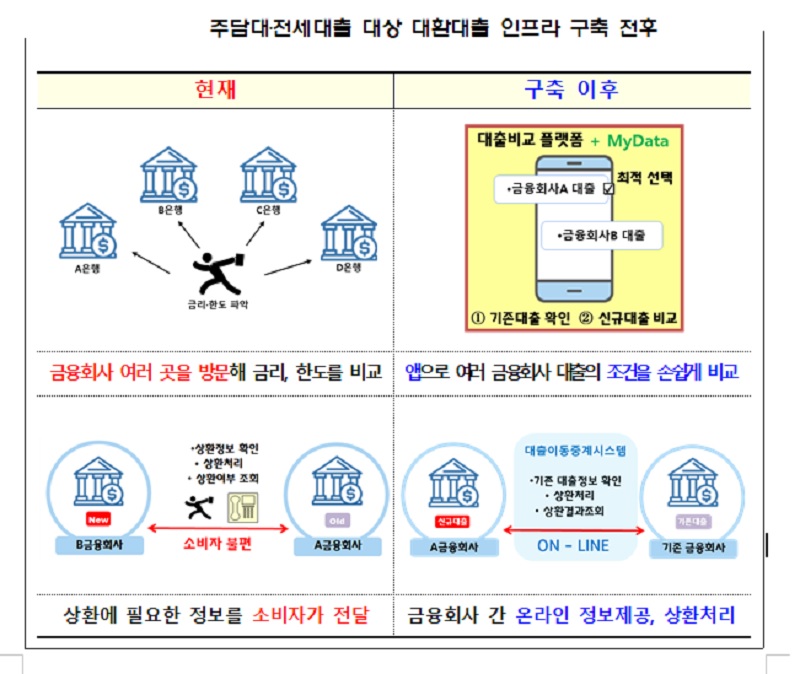 아울러 금융사 간 소비자의 기존대출 정보를 주고받고 대출금 입금 등 상환 절차를 중계하는 대출이동중계시스템을 구축해 금융사고에 대한 우려 없이 신규 금융사가 기존대출을 상환할 수 있도록 한다.