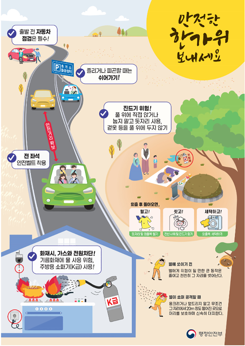 박명균 행안부 예방정책국장은 “가족과 함께하는 즐겁고 풍요로운 추석이 될 수 있도록, 국민께서는 교통사고와 화재 등 안전수칙에 관심을 갖고 사고 예방에 각별히 유의하여 안전한 추석명절을 보내시길 바란다”고 당부했다.