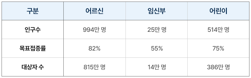 A. 사업 대상자 수는 어린이, 임신부, 어르신 총 1215만 명*입이다. * 행정안전부 주민등록 인구통계 2023년 3월 기준(약 1533만), 대상자별 목표 접종률을 반영한 인구