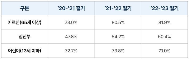 A. 지난 3개 절기 인플루엔자 예방접종 사업 결과, 접종률은 아래와 같다.