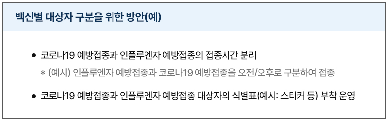 즉, 접수·예진·접종 단계 시 접종 대상자 및 접종 백신 종류를 환자 본인 및 시스템으로 확인한다. 또한 코로나19와 인플루엔자 동시 접종 시 접종 부위를 구분해 접종 및 등록해야 한다.