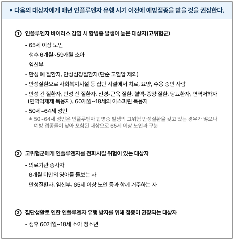 올해는 지속적으로 인플루엔자가 유행하고 있어 65세 이상 어르신, 임신부, 어린이의 경우 적극적으로 예방접종을 받는 것이 중요하다.